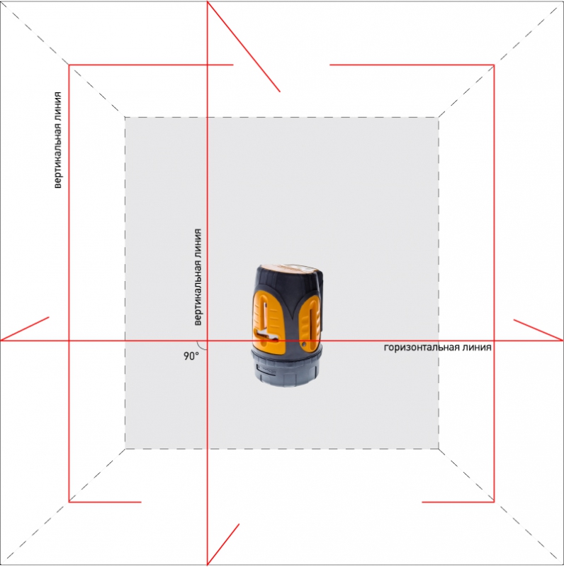 Прибор способен строить лазерные линии в четырех плоскостях, т.е. 3 линии в вертикальной плоскости и 1 линия - в горизонтальной, образуя один лазерный крест перед нивелиром.